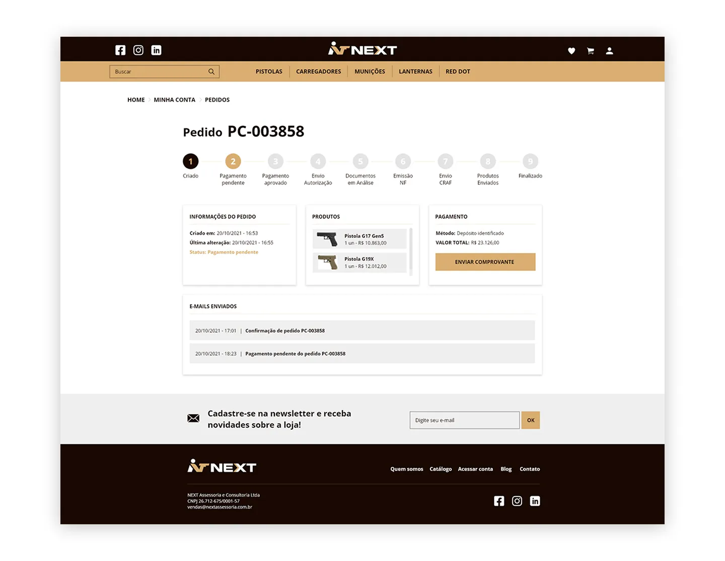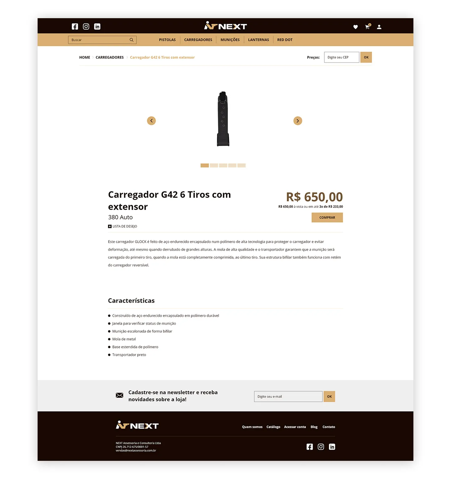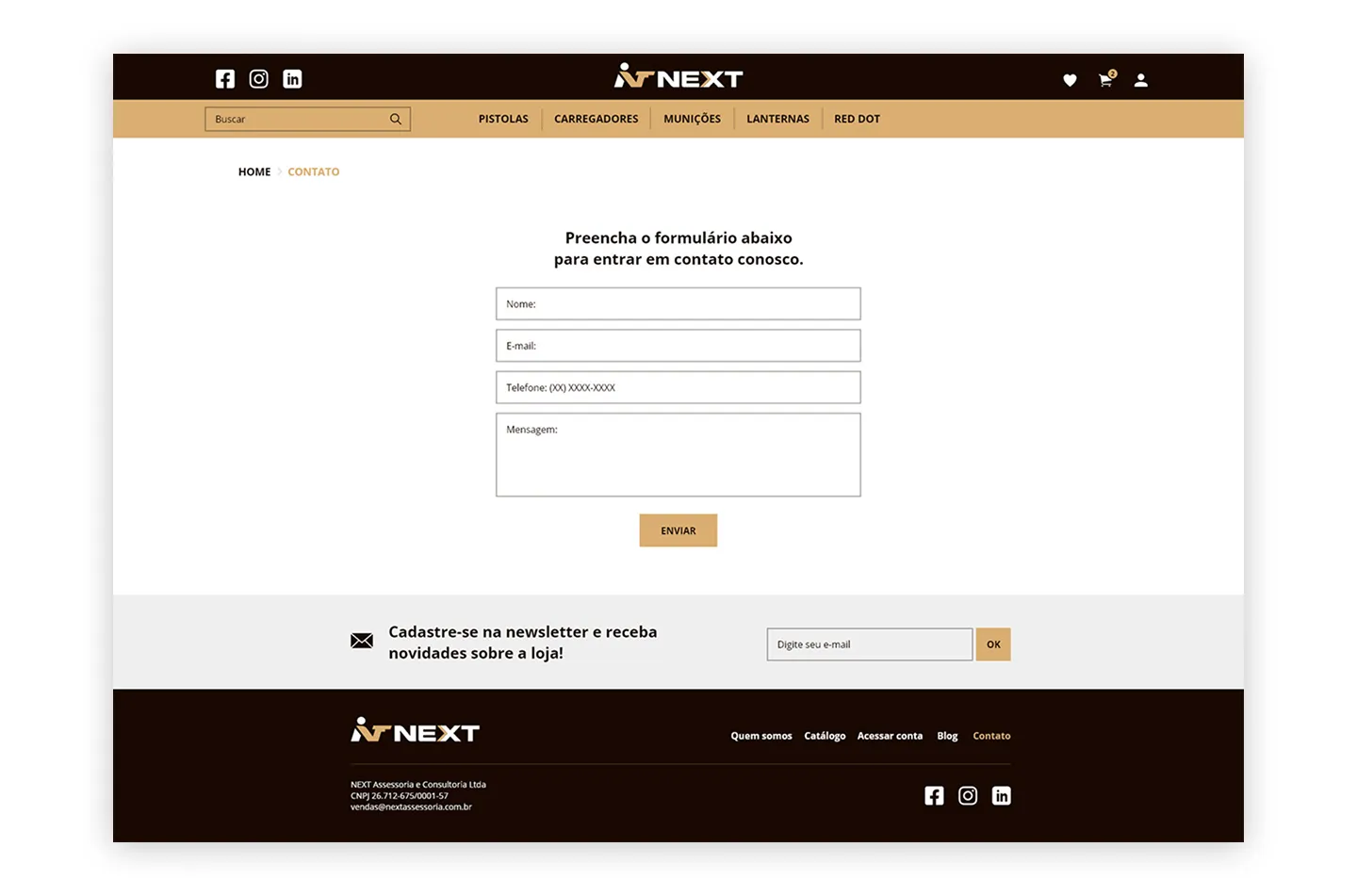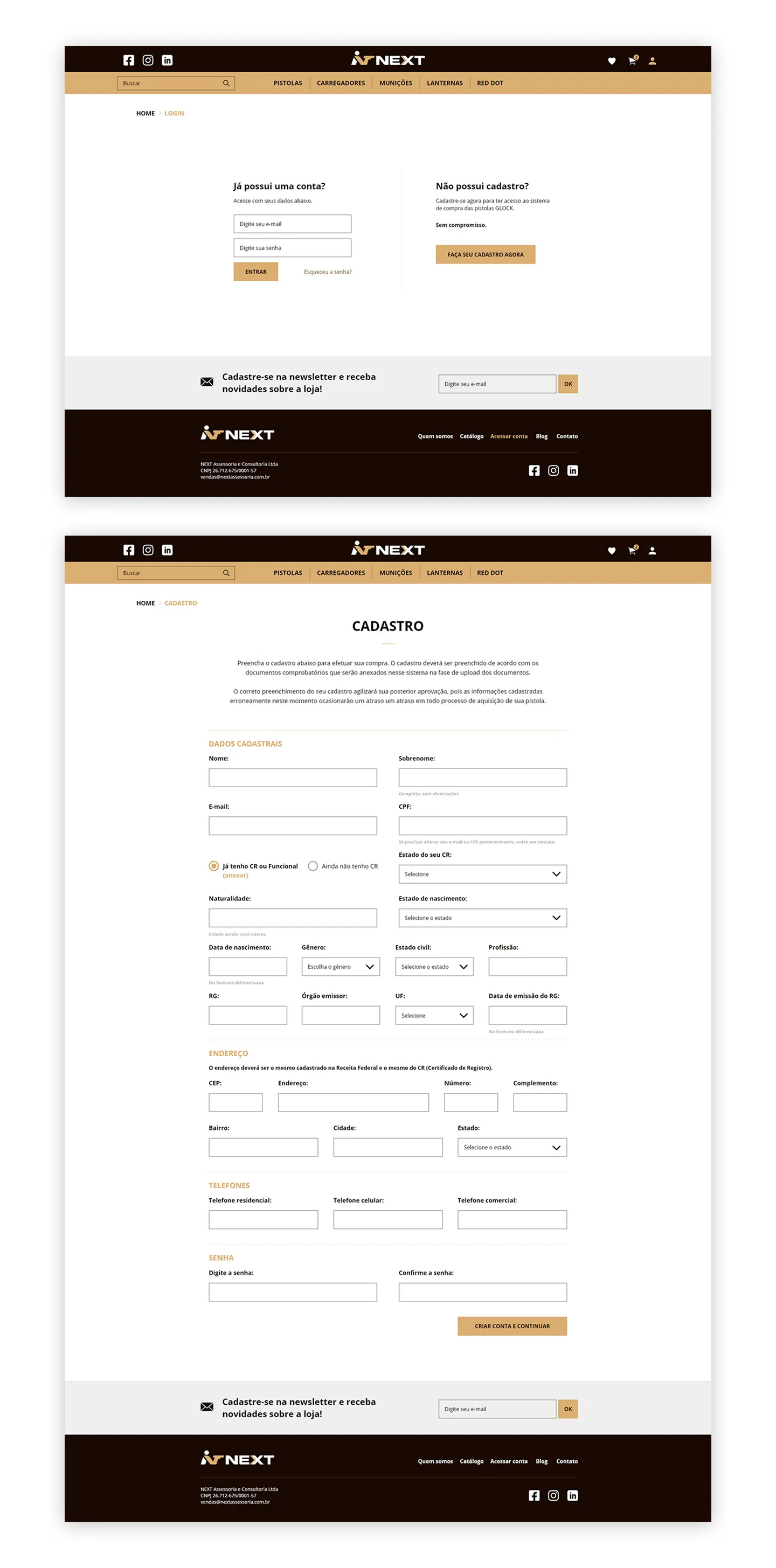 O projeto teve como objetivo a criação do design completo da loja virtual, priorizando clareza, organização e usabilidade. Por se tratar de um segmento que exige um processo de compra diferenciado — como a verificação de documentos e autorizações específicas para a aquisição de armas e acessórios — foi essencial estruturar uma experiência que orientasse o usuário de forma transparente e segura em todas as etapas.